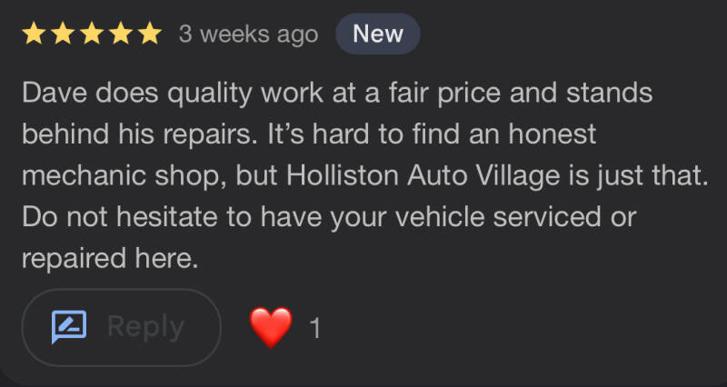At Holliston Auto Village, we believe every customer deserves honest answers, expert repairs, and fair pricing—without the pressure or runaround. As a family-run business based in Holliston, MA, we’ve built our name on trust, transparency, and doing right by our neighbors.
